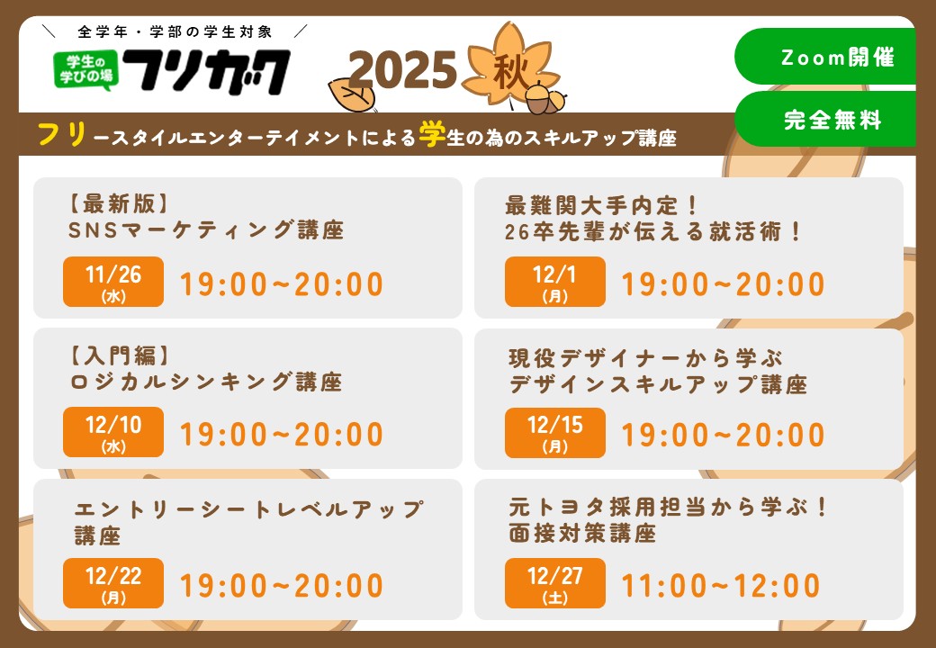 この秋(11月~)にフリガクでは、学生向けスキルアップ講座をオンラインで開催します!